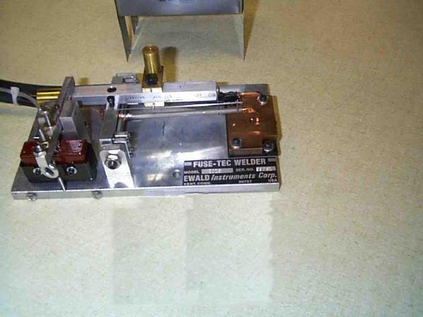 Fuse-Tec tm Micro Welding Head – Model 3015 1. This welding head is designed for welding extremely delicate parts such as cross-wire welds below .002″ (.05mm)dia. down to approx. .0002″ (.005mm)dia. in Chromel/Alumel, Pt/Pt-Rho and other very fine wires. 2. The welding pressure is adjustable from 3 grams to 50 grams (approx. .1 to 2 Oz.). 3. To insure adequate forging action of the electrode, the effective inertia of the welding arm is held to less than 2 grams. Suspension is in precision miniature ball bearings. 4. Actuation is by footpedal. The power supply is triggered when the pre-set electrode pressure is reached. 5. Electrodes: Upper – .010″ x .030″ Tungsten or .010″ x .020″ RWMA II. Lower – 1/8′ รถ RWMA II, flat tip. 6. Throat – 3.5″; Stroke – .5″ Dimensions: 4.5″ wide x 8″ deep x 3″ high. Weight – Approx. 4 lbs. 7. Power Supply: The welding head can be used with stored energy power supplies of up to 1 watt-sec., or small AC synchronous controls. 8. Accessories included: Welding cables – #8AWG x 12″; Footpedal and chain
